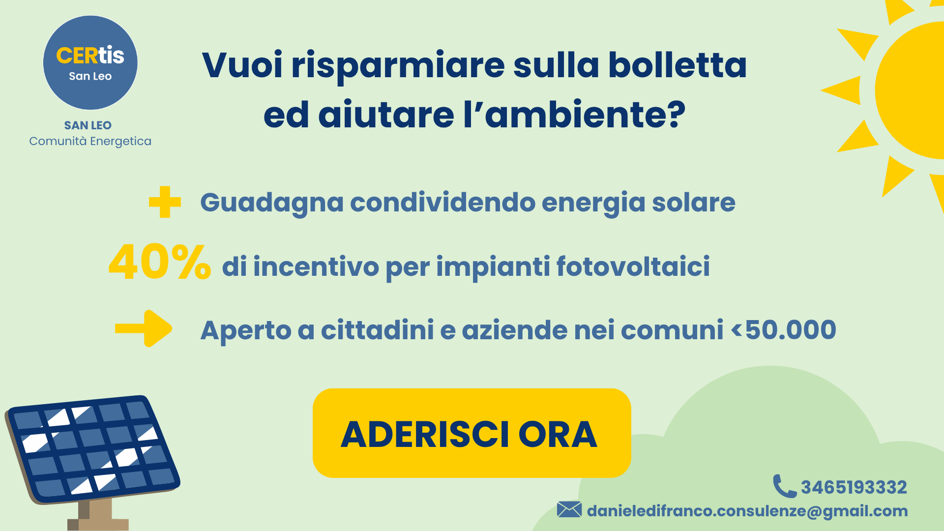 Un passo deciso verso una transizione energetica sostenibile e partecipata ha preso forma proprio in Valmarecchia: da oggi, mercoledì 3 settembre 2025, nel Comune di San Leo nasce ufficialmente CERtis, la Comunità Energetica tra Imprese e Solidali, un progetto innovativo che riunisce aziende e cittadini con l’obiettivo di produrre e condividere energia da fonti rinnovabili, creando benefici ambientali, economici e sociali per tutto il territorio.